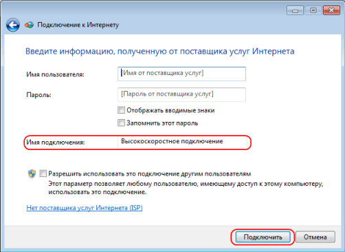 8. «Имя пользователя» и «Пароль» пока вводить не стоит, текст в строке «Имя подключения» можно изменить. Нажмите «Подключить».