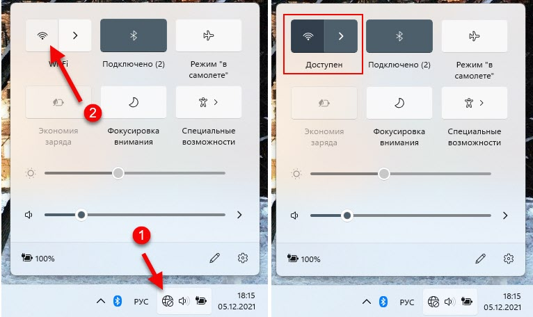 1. Нажмите на иконку подключения (в Windows 11 одновременно подсвечивается иконка подключения к интернету, звука и управления электропитанием) в трее (в правом нижнем углу). Там должна быть кнопка Wi-Fi. Если он выключен, то нужно сначала нажать на кнопку для включения Wi-Fi. Или перейти в настройки (рядом кнопка со стрелочкой) и уже там включить.