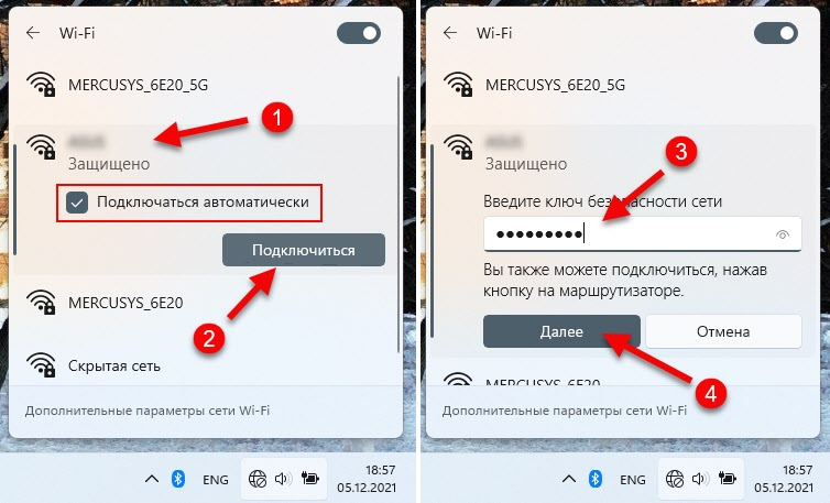 Дальше нажимаем на Wi-Fi сеть к которой хотим подключиться. Если необходимо, чтобы Windows 11 в дальнейшем подключалась к этой сети автоматически – ставим галочку возле «Подключаться автоматически» и нажимаем на кнопку «Подключиться». Затем вводим пароль (ключ безопасности сети) от Wi-Fi сети и нажимаем на кнопку «Далее».