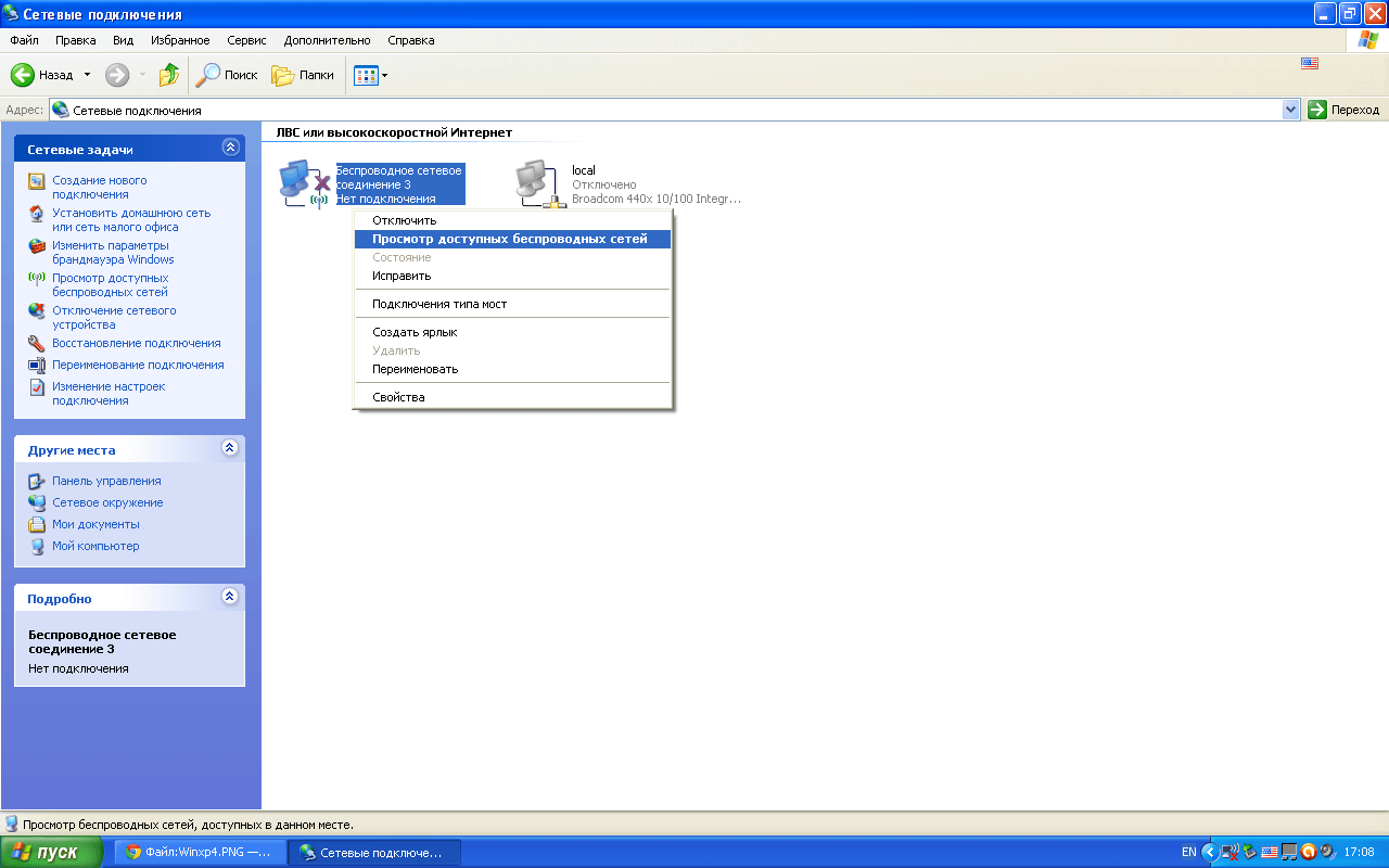 1. Нажмите «Пуск» → «Панель управления» → «Сетевые подключения». На иконке «Беспроводного сетевого соединения» нажмите правой кнопкой мыши. В открывшемся контекстном меню нажмите «Просмотр доступных беспроводных сетей»