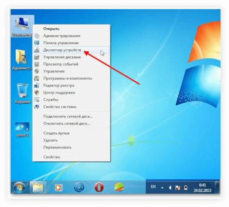 Зайдите в «Пуск» и наведите стрелку на компьютер, нажмите правую кнопку мышки, далее жмите «Диспетчер устройств»