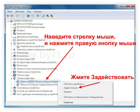 В списке устройств раскройте «Сетевые адаптеры» и нажмите правой кнопкой мыши по адаптеру Wi-Fi. Нажмите «Задействовать».