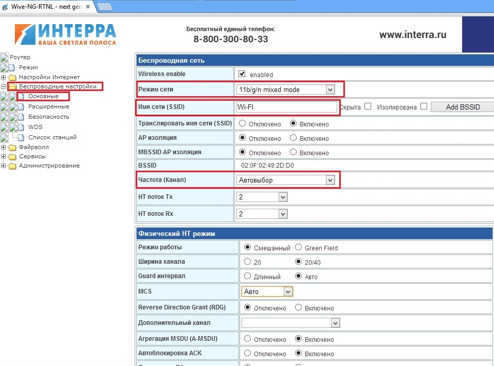 Настраиваем Wi-Fi сеть. В левой колонке открываем «Беспроводные настройки», затем «Основные». Меняем режим сети на 802.11 b/g/n mixed. В поле «SSID» вводим желаемое название вашей сети. Частоту (канал) желательно изменить на автоматическую. Нажимаем «Применить».
