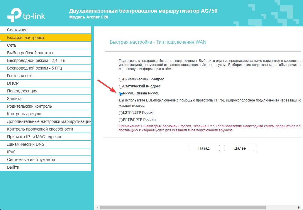 3. Из доступных вариантов выбираем «PPPoE/Russia PPPoE (PPPoE Россия)» и нажимаем «Далее».