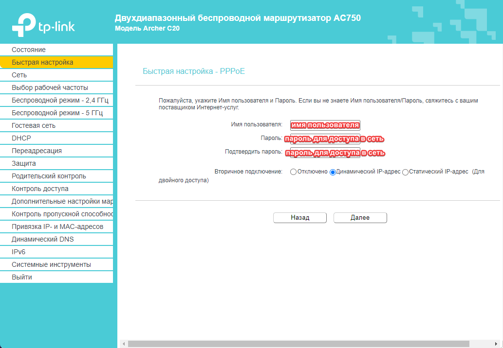 4. Вводим имя пользователя и пароль для доступа в сеть из договора, также подтверждаем пароль.